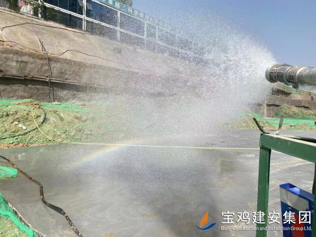 工程現(xiàn)場(chǎng)采用全封閉施工,主要道路混凝土硬化,周邊種植了抑塵效果明顯的花卉與綠植,施工現(xiàn)場(chǎng)采用移動(dòng)式灑水車,定人、定時(shí)進(jìn)行灑水降塵作業(yè),工地出入口安裝了全自動(dòng)三聯(lián)裝洗車臺(tái),保證車輛出入清潔。設(shè)置的移動(dòng)式降塵霧炮、噴淋系統(tǒng),有效限制了施工揚(yáng)塵,裸露場(chǎng)地和堆放粉塵材料的地方采取防塵網(wǎng)進(jìn)行 100%全面覆蓋,從源頭控制揚(yáng)塵污染。